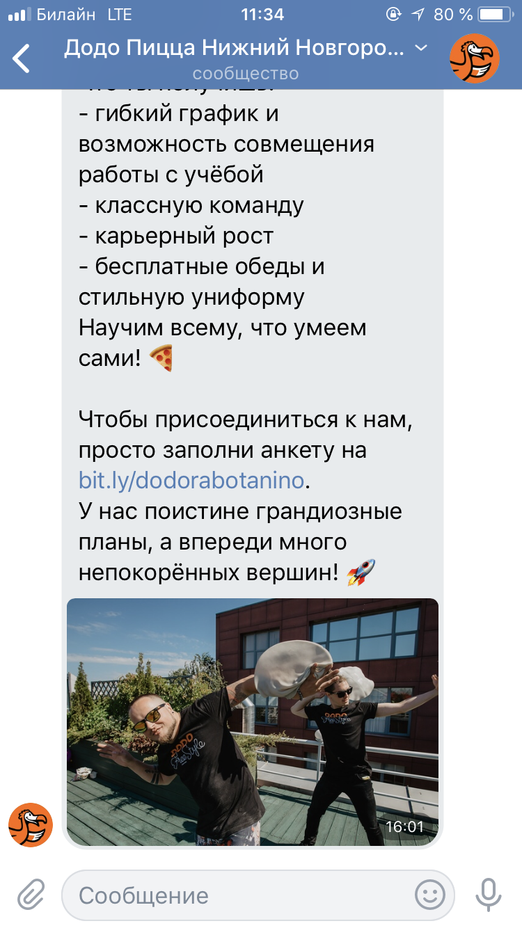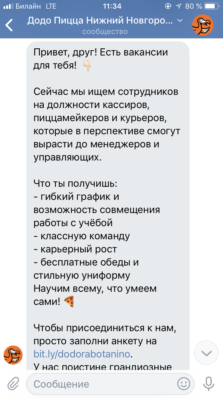 А ДоДо пицца иногда позволяет себе сделать рассылку по своим клиентам в соц. сетях. Причем не по всем, а только по подписчикам спец.предложений и акций, то есть заведомо лояльным клиентам. Все очень кратко, акцент на плюшках компании, забавное фото с работниками и ссылка на открытые вакансии. Почему бы и нет?