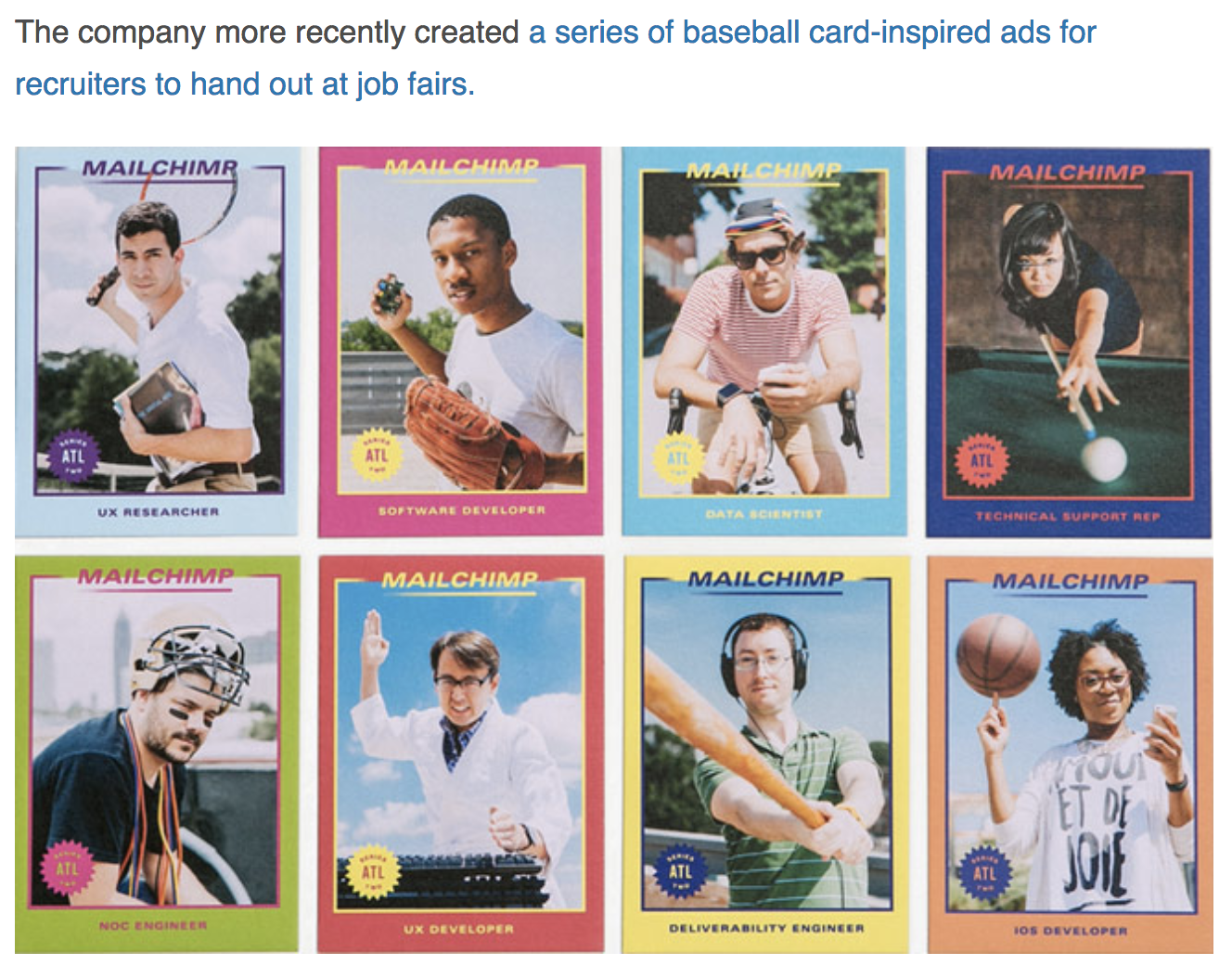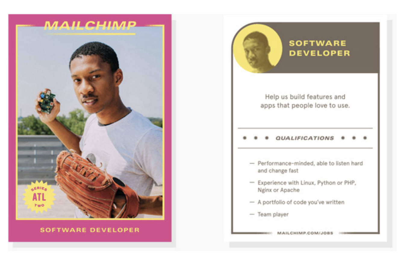 И если подытожить все вышесказанное: классный текст, необычная подача, крутая идея, плюс стильный дизайн = самое яркое и запоминающееся предложение на рынке труда. И тут опять приводим в пример Mailchimp. Ребята подают вакансии в виде спортивных карточек (ну вот эти, знаете, со звездами бейсбола из американских фильмов). Все это добавляет дополнительного смысла, что звездой можно стать в своей профессии, работая в классной команде Mailchimp’a.