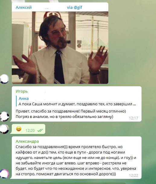 Также Анна создала чат в Телеграме, в котором в течение испытательного срока собираются все новички. В нем можно задавать любые вопросы и удобно поздравлять каждого с майлстоунами – месяц, два, завершение испытательного срока. В чате есть традиционный хэштег #пятничнаяистория, под ним регулярно добавляются забавные истории из жизни компании, короткие ролики и т.п.
